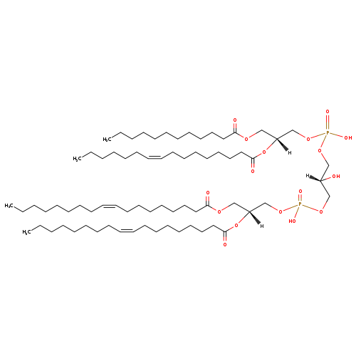 | YMDB11582 | 1-MLCL(0:0/12:0/16:1(9Z)/18:1(9Z)) | [(2S)-3-({[(2R)-2-(dodecanoyloxy)-3-hydroxypropoxy](hydroxy)phosphoryl}oxy)-2-hydroxypropoxy][(2R)-3-[(9Z)-hexadec-9-enoyloxy]-2-[(9Z)-octadec-9-enoyloxy]propoxy]phosphinic acid | C55H104O16P2 1083.369 | |