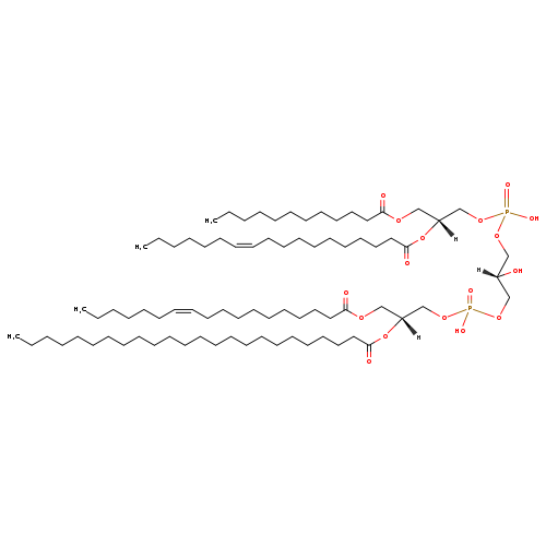| YMDB06403 | CL(12:0/18:1(11Z)/18:1(11Z)/24:0) | [(2R)-3-(dodecanoyloxy)-2-[(11Z)-octadec-11-enoyloxy]propoxy][(2R)-2-hydroxy-3-({hydroxy[(2R)-3-[(11Z)-octadec-11-enoyloxy]-2-(tetracosanoyloxy)propoxy]phosphoryl}oxy)propoxy]phosphinic acid | C81H154O17P2 1462.054 | |