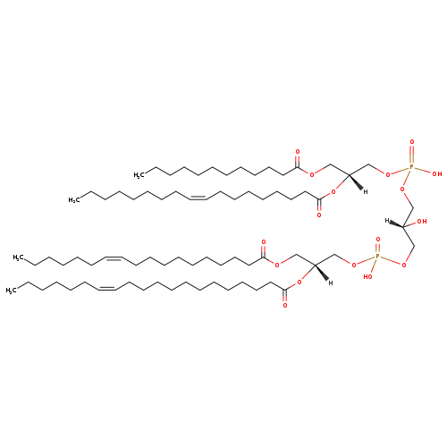 | YMDB06439 | CL(12:0/18:1(9Z)/18:1(11Z)/20:1(13Z)) | [(2R)-3-(dodecanoyloxy)-2-[(9Z)-octadec-9-enoyloxy]propoxy][(2R)-2-hydroxy-3-({hydroxy[(2R)-2-[(13Z)-icos-13-enoyloxy]-3-[(11Z)-octadec-11-enoyloxy]propoxy]phosphoryl}oxy)propoxy]phosphinic acid | C77H144O17P2 1403.93 | |