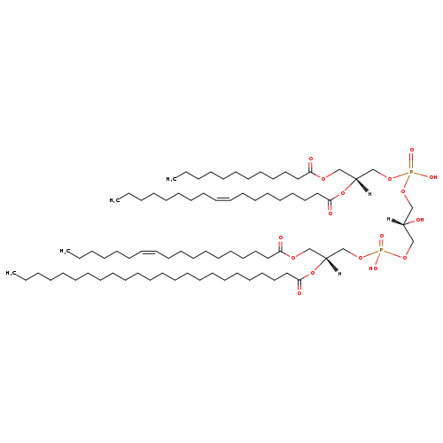 | YMDB06443 | CL(12:0/18:1(9Z)/18:1(11Z)/24:0) | [(2R)-3-(dodecanoyloxy)-2-[(9Z)-octadec-9-enoyloxy]propoxy][(2R)-2-hydroxy-3-({hydroxy[(2R)-3-[(11Z)-octadec-11-enoyloxy]-2-(tetracosanoyloxy)propoxy]phosphoryl}oxy)propoxy]phosphinic acid | C81H154O17P2 1462.054 | |