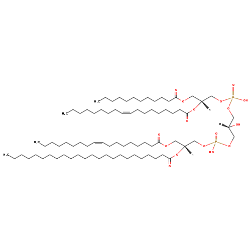 | YMDB06454 | CL(12:0/18:1(9Z)/18:1(9Z)/24:0) | [(2R)-3-(dodecanoyloxy)-2-[(9Z)-octadec-9-enoyloxy]propoxy][(2R)-2-hydroxy-3-({hydroxy[(2R)-3-[(9Z)-octadec-9-enoyloxy]-2-(tetracosanoyloxy)propoxy]phosphoryl}oxy)propoxy]phosphinic acid | C81H154O17P2 1462.054 | |
