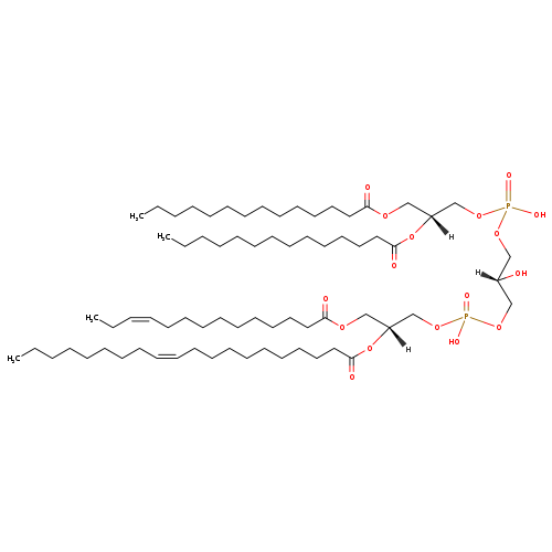 | YMDB06531 | CL(14:0/14:0/14:1(11Z)/20:1(11Z)) | [(2S)-3-({[(2R)-2,3-bis(tetradecanoyloxy)propoxy](hydroxy)phosphoryl}oxy)-2-hydroxypropoxy][(2R)-2-[(11Z)-icos-11-enoyloxy]-3-[(11Z)-tetradec-11-enoyloxy]propoxy]phosphinic acid | C71H134O17P2 1321.784 | |