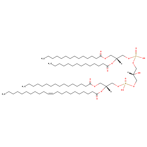 | YMDB11824 | 2-MLCL(14:0/14:0/16:0/0:0) | [(2R)-2,3-bis(tetradecanoyloxy)propoxy][(2R)-3-({[(2R)-3-(hexadecanoyloxy)-2-hydroxypropoxy](hydroxy)phosphoryl}oxy)-2-hydroxypropoxy]phosphinic acid | C53H104O16P2 1059.347 | |