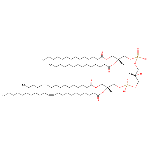 | YMDB06619 | CL(14:0/14:0/16:1(11Z)/22:1(11Z)) | [(2S)-3-({[(2R)-2,3-bis(tetradecanoyloxy)propoxy](hydroxy)phosphoryl}oxy)-2-hydroxypropoxy][(2R)-2-[(11Z)-docos-11-enoyloxy]-3-[(11Z)-hexadec-11-enoyloxy]propoxy]phosphinic acid | C75H142O17P2 1377.892 | |