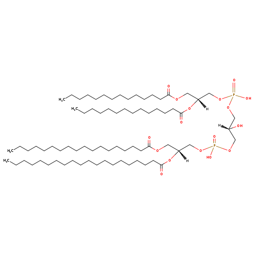 | YMDB06650 | CL(14:0/14:0/18:0/20:0) | [(2S)-3-({[(2R)-2,3-bis(tetradecanoyloxy)propoxy](hydroxy)phosphoryl}oxy)-2-hydroxypropoxy][(2R)-2-(icosanoyloxy)-3-(octadecanoyloxy)propoxy]phosphinic acid | C75H146O17P2 1381.924 | |
