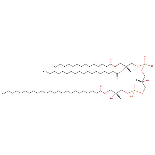 | YMDB06656 | CL(14:0/14:0/18:0/24:0) | [(2S)-3-({[(2R)-2,3-bis(tetradecanoyloxy)propoxy](hydroxy)phosphoryl}oxy)-2-hydroxypropoxy][(2R)-3-(octadecanoyloxy)-2-(tetracosanoyloxy)propoxy]phosphinic acid | C79H154O17P2 1438.032 | |