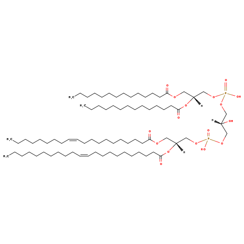 | YMDB06695 | CL(14:0/14:0/20:1(11Z)/22:1(11Z)) | [(2S)-3-({[(2R)-2,3-bis(tetradecanoyloxy)propoxy](hydroxy)phosphoryl}oxy)-2-hydroxypropoxy][(2R)-2-[(11Z)-docos-11-enoyloxy]-3-[(11Z)-icos-11-enoyloxy]propoxy]phosphinic acid | C79H150O17P2 1434.0 | |