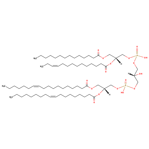 | YMDB06850 | CL(14:0/14:1(11Z)/18:1(11Z)/18:1(9Z)) | [(2S)-2-hydroxy-3-({hydroxy[(2R)-2-[(11Z)-tetradec-11-enoyloxy]-3-(tetradecanoyloxy)propoxy]phosphoryl}oxy)propoxy][(2R)-3-[(11Z)-octadec-11-enoyloxy]-2-[(9Z)-octadec-9-enoyloxy]propoxy]phosphinic acid | C73H136O17P2 1347.822 | |