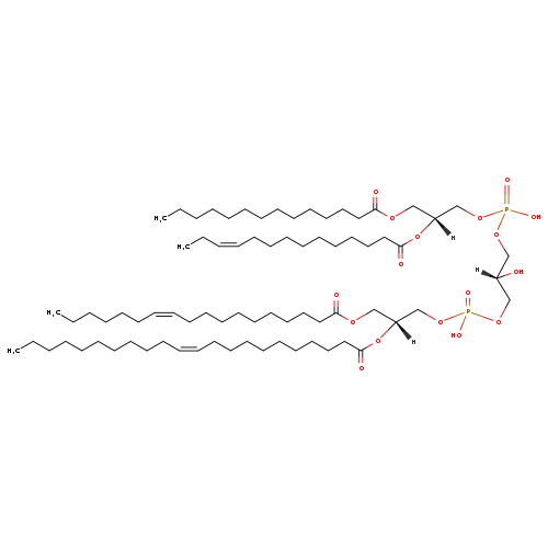 | YMDB06855 | CL(14:0/14:1(11Z)/18:1(11Z)/22:1(11Z)) | [(2R)-2-[(11Z)-docos-11-enoyloxy]-3-[(11Z)-octadec-11-enoyloxy]propoxy][(2S)-2-hydroxy-3-({hydroxy[(2R)-2-[(11Z)-tetradec-11-enoyloxy]-3-(tetradecanoyloxy)propoxy]phosphoryl}oxy)propoxy]phosphinic acid | C77H144O17P2 1403.93 | |
