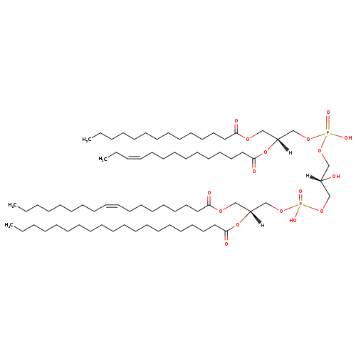 | YMDB06865 | CL(14:0/14:1(11Z)/18:1(9Z)/20:0) | [(2S)-2-hydroxy-3-({hydroxy[(2R)-2-[(11Z)-tetradec-11-enoyloxy]-3-(tetradecanoyloxy)propoxy]phosphoryl}oxy)propoxy][(2R)-2-(icosanoyloxy)-3-[(9Z)-octadec-9-enoyloxy]propoxy]phosphinic acid | C75H142O17P2 1377.892 | |