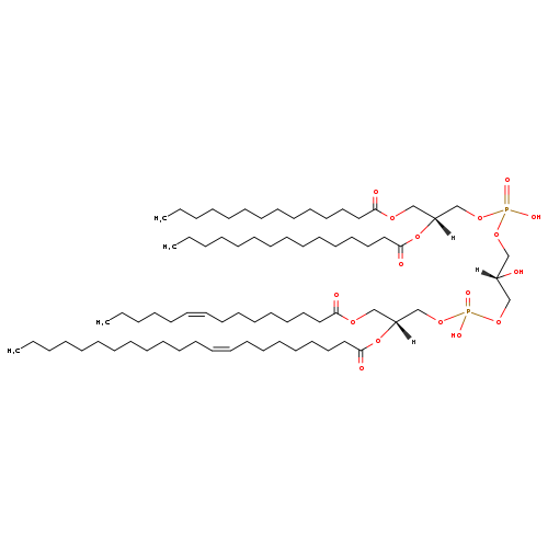 | YMDB11516 | 1-MLCL(0:0/14:0/15:0/15:1(9Z)) | [(2S)-2-hydroxy-3-({hydroxy[(2R)-3-hydroxy-2-(tetradecanoyloxy)propoxy]phosphoryl}oxy)propoxy][(2R)-2-[(9Z)-pentadec-9-enoyloxy]-3-(pentadecanoyloxy)propoxy]phosphinic acid | C53H102O16P2 1057.331 | |