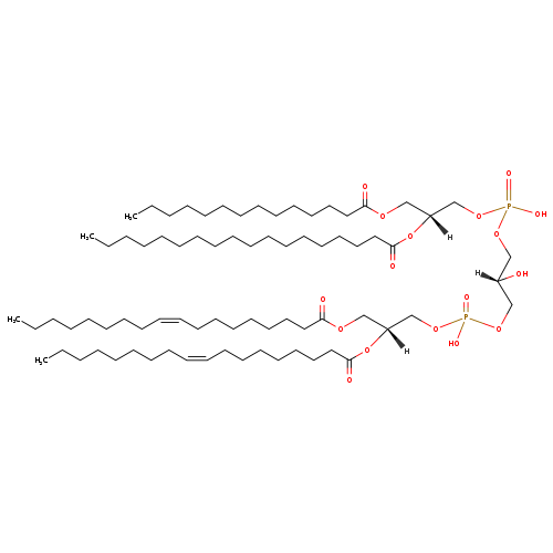 | YMDB07687 | CL(14:0/18:0/18:1(9Z)/18:1(9Z)) | [(2R)-2,3-bis[(9Z)-octadec-9-enoyloxy]propoxy][(2S)-2-hydroxy-3-({hydroxy[(2R)-2-(octadecanoyloxy)-3-(tetradecanoyloxy)propoxy]phosphoryl}oxy)propoxy]phosphinic acid | C77H146O17P2 1405.946 | |