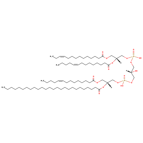 | YMDB07973 | CL(14:1(11Z)/14:1(9Z)/14:1(9Z)/26:0) | [(2R)-3-({[(2R)-2-(hexacosanoyloxy)-3-[(9Z)-tetradec-9-enoyloxy]propoxy](hydroxy)phosphoryl}oxy)-2-hydroxypropoxy][(2R)-3-[(11Z)-tetradec-11-enoyloxy]-2-[(9Z)-tetradec-9-enoyloxy]propoxy]phosphinic acid | C77H144O17P2 1403.93 | |