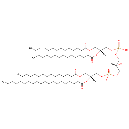 | YMDB08129 | CL(14:1(11Z)/15:0/15:0/20:0) | [(2R)-2-hydroxy-3-({hydroxy[(2R)-2-(icosanoyloxy)-3-(pentadecanoyloxy)propoxy]phosphoryl}oxy)propoxy][(2R)-2-(pentadecanoyloxy)-3-[(11Z)-tetradec-11-enoyloxy]propoxy]phosphinic acid | C73H140O17P2 1351.854 | |