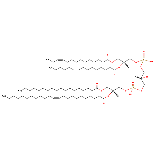 | YMDB08384 | CL(14:1(11Z)/15:1(9Z)/18:0/23:1(11Z)) | [(2R)-2-hydroxy-3-({hydroxy[(2R)-3-(octadecanoyloxy)-2-[(11Z)-tricos-11-enoyloxy]propoxy]phosphoryl}oxy)propoxy][(2R)-2-[(9Z)-pentadec-9-enoyloxy]-3-[(11Z)-tetradec-11-enoyloxy]propoxy]phosphinic acid | C79H148O17P2 1431.984 | |