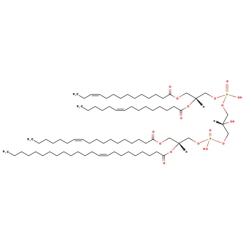 | YMDB08390 | CL(14:1(11Z)/15:1(9Z)/18:1(11Z)/23:1(9Z)) | [(2S)-2-hydroxy-3-({hydroxy[(2R)-2-[(9Z)-pentadec-9-enoyloxy]-3-[(11Z)-tetradec-11-enoyloxy]propoxy]phosphoryl}oxy)propoxy][(2R)-3-[(11Z)-octadec-11-enoyloxy]-2-[(9Z)-tricos-9-enoyloxy]propoxy]phosphinic acid | C79H146O17P2 1429.968 | |