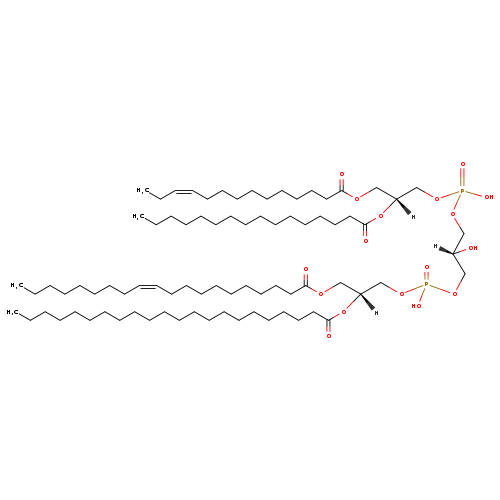 | YMDB08501 | CL(14:1(11Z)/16:0/20:1(11Z)/22:0) | [(2R)-2-(docosanoyloxy)-3-[(11Z)-icos-11-enoyloxy]propoxy][(2S)-3-({[(2R)-2-(hexadecanoyloxy)-3-[(11Z)-tetradec-11-enoyloxy]propoxy](hydroxy)phosphoryl}oxy)-2-hydroxypropoxy]phosphinic acid | C81H154O17P2 1462.054 | |