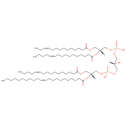 | YMDB08522 | CL(14:1(11Z)/16:1(11Z)/16:1(11Z)/22:1(11Z)) | [(2R)-2-[(11Z)-docos-11-enoyloxy]-3-[(11Z)-hexadec-11-enoyloxy]propoxy][(2S)-3-({[(2R)-2-[(11Z)-hexadec-11-enoyloxy]-3-[(11Z)-tetradec-11-enoyloxy]propoxy](hydroxy)phosphoryl}oxy)-2-hydroxypropoxy]phosphinic acid | C77H142O17P2 1401.914 | |
