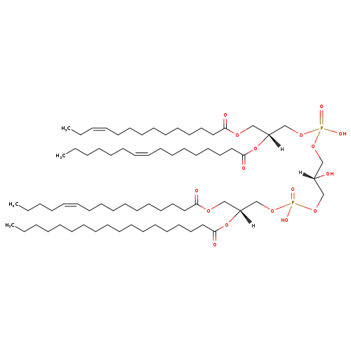 | YMDB08603 | CL(14:1(11Z)/16:1(9Z)/16:1(11Z)/18:0) | [(2R)-3-({[(2R)-3-[(11Z)-hexadec-11-enoyloxy]-2-(octadecanoyloxy)propoxy](hydroxy)phosphoryl}oxy)-2-hydroxypropoxy][(2R)-2-[(9Z)-hexadec-9-enoyloxy]-3-[(11Z)-tetradec-11-enoyloxy]propoxy]phosphinic acid | C73H136O17P2 1347.822 | |