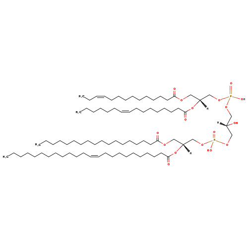 | YMDB08645 | CL(14:1(11Z)/16:1(9Z)/18:0/24:1(11Z)) | [(2R)-2-[(9Z)-hexadec-9-enoyloxy]-3-[(11Z)-tetradec-11-enoyloxy]propoxy][(2R)-2-hydroxy-3-({hydroxy[(2R)-3-(octadecanoyloxy)-2-[(11Z)-tetracos-11-enoyloxy]propoxy]phosphoryl}oxy)propoxy]phosphinic acid | C81H152O17P2 1460.038 | |