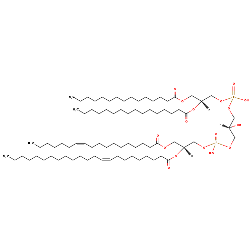 | YMDB10206 | CL(15:0/16:0/18:1(11Z)/23:1(9Z)) | [(2S)-3-({[(2R)-2-(hexadecanoyloxy)-3-(pentadecanoyloxy)propoxy](hydroxy)phosphoryl}oxy)-2-hydroxypropoxy][(2R)-3-[(11Z)-octadec-11-enoyloxy]-2-[(9Z)-tricos-9-enoyloxy]propoxy]phosphinic acid | C81H154O17P2 1462.054 | |