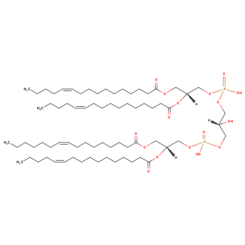 | YMDB11094 | CL(16:1(11Z)/16:1(11Z)/16:1(9Z)/16:1(11Z)) | [(2S)-3-({[(2R)-2,3-bis[(11Z)-hexadec-11-enoyloxy]propoxy](hydroxy)phosphoryl}oxy)-2-hydroxypropoxy][(2R)-2-[(11Z)-hexadec-11-enoyloxy]-3-[(9Z)-hexadec-9-enoyloxy]propoxy]phosphinic acid | C73H134O17P2 1345.806 | |