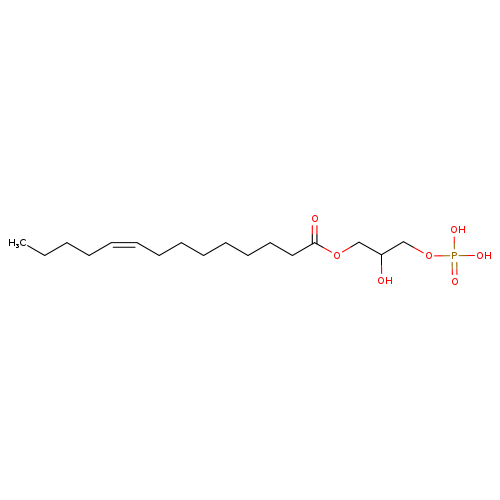 | YMDB13276 | LPA(14:1(9Z)/0:0) | {2-hydroxy-3-[(9Z)-tetradec-9-enoyloxy]propoxy}phosphonic acid | C17H33O7P 380.418 | |