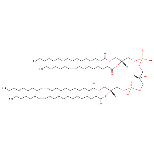 Matched Description: … 'double' phospholipid because they have four fatty acid tails, instead of the usual two. CL(15:1(9Z ... (11Z-pentadecenoyl) at the C2 position, one chain of eicosanoic acid at the C3 position, one chain of ... acyl chains ranging in length from 12 to 18 carbons and possibly containing an unsaturation, or a …